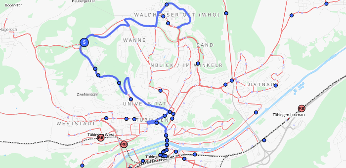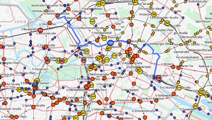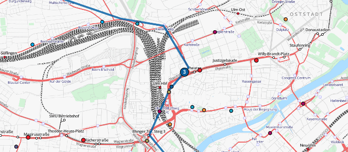 - Aufbau eines Graphen aus z.B. Schienen- oder Straßengeometrien und Einsortieren der Stationen aus dem GTFS-Feed