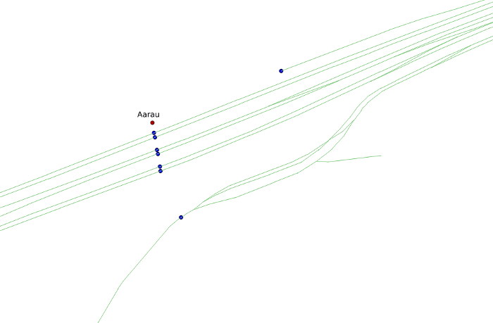 Diese Kandidaten werden nun mit einer Dummy-Kante mit der Primärstation (= die am besten gematchte Station) verbunden. Konkret heißt das z.B. im Schienennetz, dass wir Zügen erlauben, in Stationen die Gleise zu wechseln. Ohne diese Spezialkante wäre eine erfolgreiche Routensuche nur in den wenigsten Fällen möglich. Unten ist der Bahnhof Olten mit eingeblendeten Spezialkanten zu sehen.