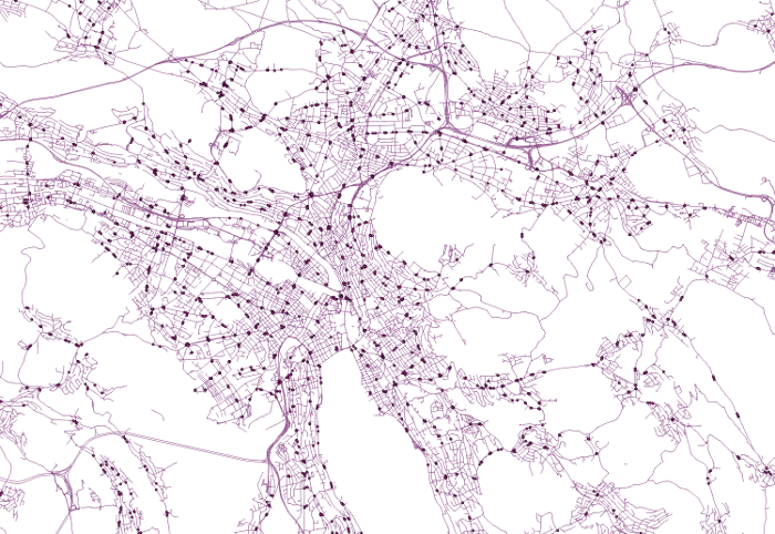 Versuche, die Menge der Schienenverkehrs-Relationen in OpenStreetMap über Ähnlichkeitsmaße (z.B. die Fréchet-Distanz) mit den Station-zu-Station-Liniengeometrien von Zugfahrten im GTFS-Feed zu vergleichen, lieferten keine brauchbaren Ergebnisse. Dass die Extrahierung der Shapes selbst für räumlich eng begrenzte Gebiete keine triviale Aufgabe ist, zeigt das (bereits in einen Graph überführte) OSM-Straßennetz von Zürich.